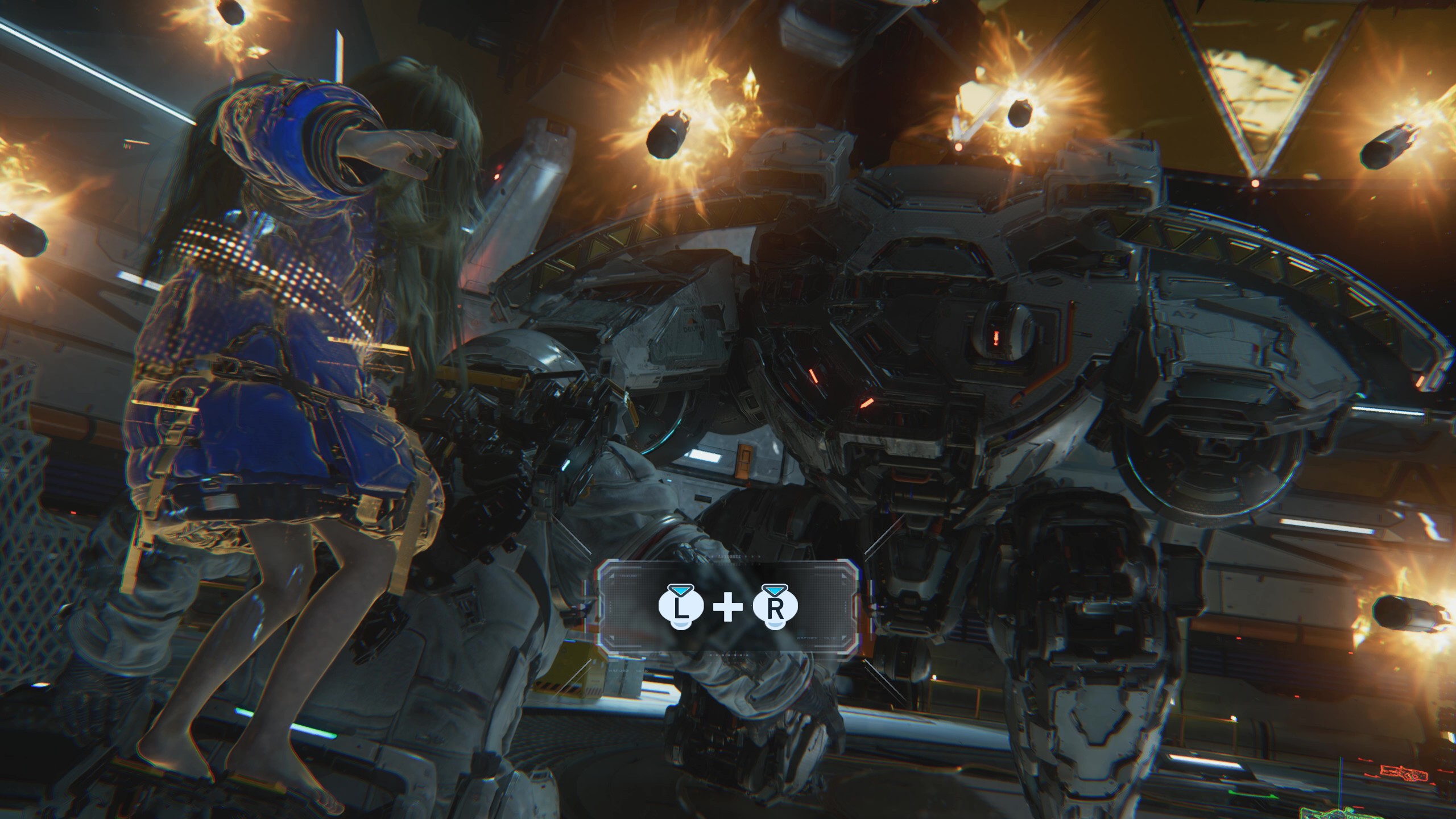 在试玩关卡中,玩家扮演士兵“休”,身背名为黛安娜的小女孩,在月球基地与机械敌人作战。